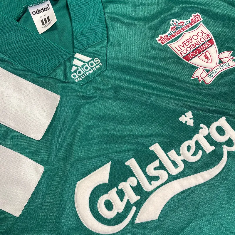 Liverpool Away football shirt from the 1992-93 inaugural Premier League seasons. Iconic Adidas design featuring the 3 stripe across the shoulder and Carlsberg sponsor across the front. Stunning green colour way with Adidas badge within the v neck collar. Size 40-42 on label.