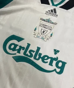 Liverpool Away football shirt from the 1993-95 seasons. Iconic Adidas design with the 3 stripe under panels, central detail and Carlsberg sponsor across the front. Stunning white, green and black colour way. Size 38-40 on label.