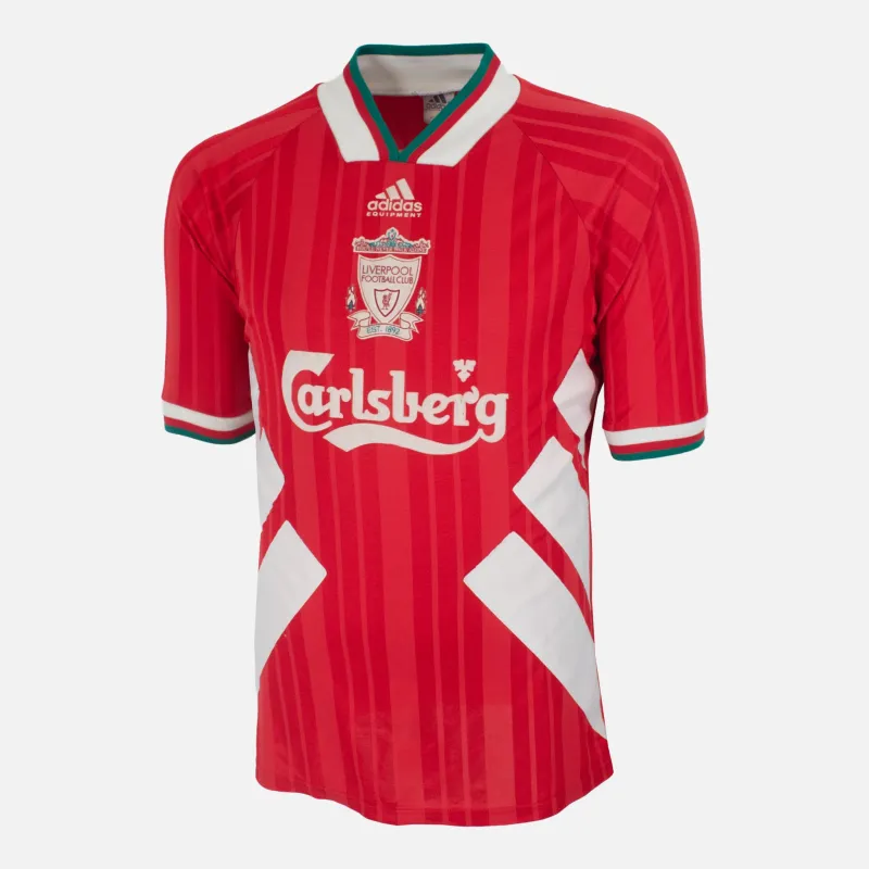 Liverpool Home football shirt from the 1993-95 Premier League seasons. Iconic Adidas design featuring the 3 stitched stripe under each arm with centralised club crest and Carlsberg sponsor. Stunning red colour way with foam style Liverpool crest and Adidas badge within the v neck collar. Size 38-40 on label.