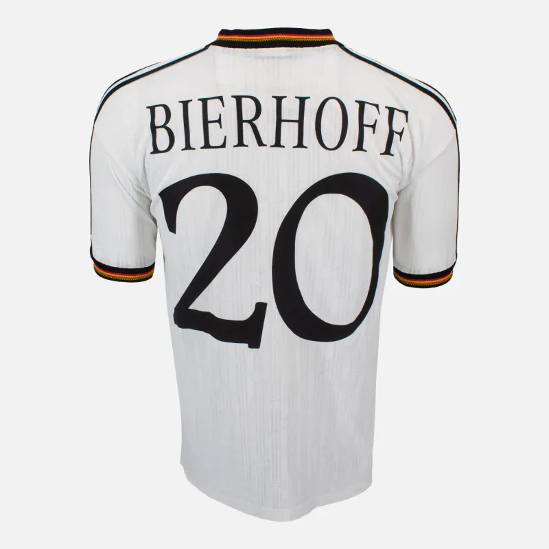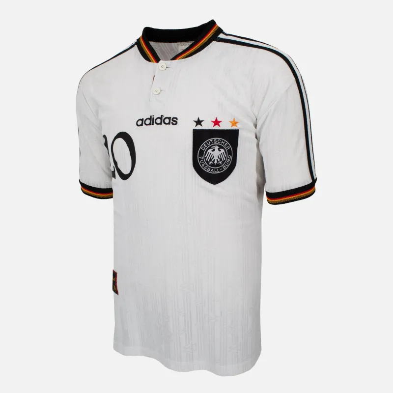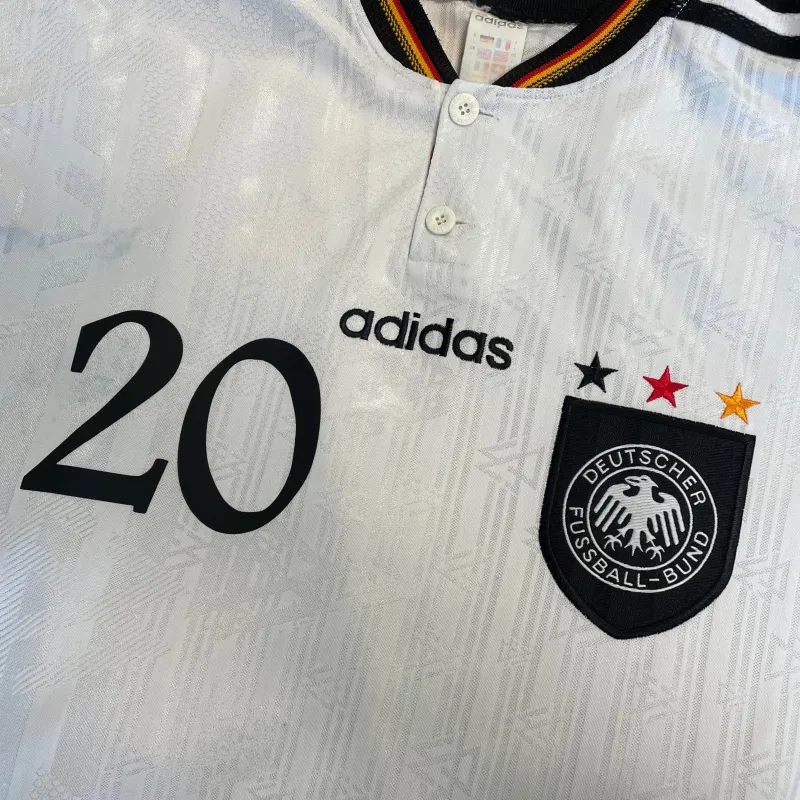 Oliver Bierhoff, Germany home football shirt from 1996-98 including the famous Euro 1996 winning tournament. Bierhoff come on as subsitute in the final to score both the equaliser and winning golden goal. Germany won the game 2-1 and were crowed Champions fo europe at Wembley. Original white kit featuring the Adidas sholder stripes and germany flag within the collar. Bierhoff 20 name and number print on reverse.