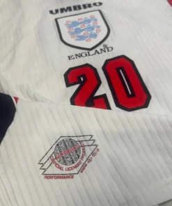 Michael Owen England Home football shirt from 1997-99 including the 1998 World Cup. England reached the quarter-finals, narrowly losing on penalties to Argentina. A fixtures remembered for Owen’s iconic solo goal at just 18 years old. Iconic design with centralised badge with red and navy detailing. Owen 20 name and number felt nameset.