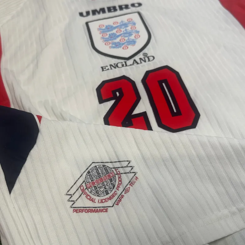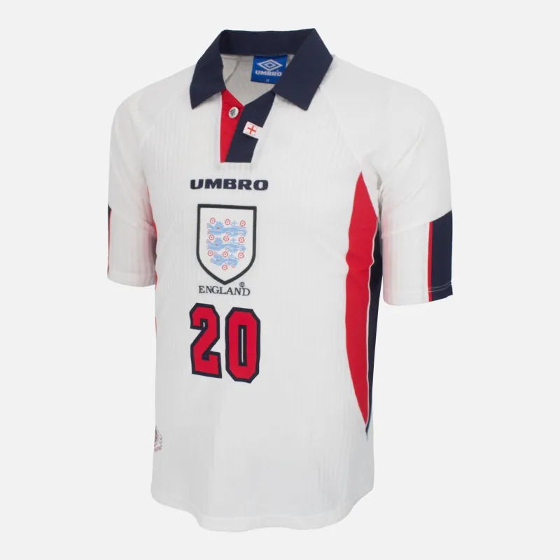 Michael Owen England Home football shirt from 1997-99 including the 1998 World Cup. England reached the quarter-finals, narrowly losing on penalties to Argentina. A fixtures remembered for Owen’s iconic solo goal at just 18 years old. Iconic design with centralised badge with red and navy detailing. Owen 20 name and number felt nameset.