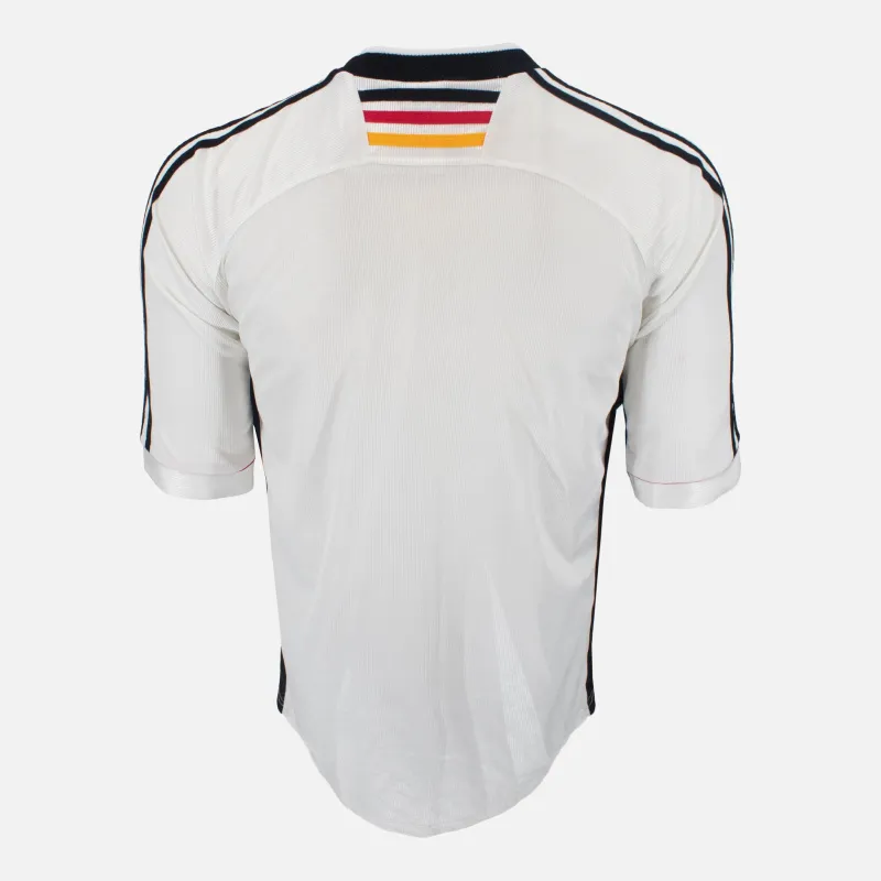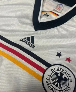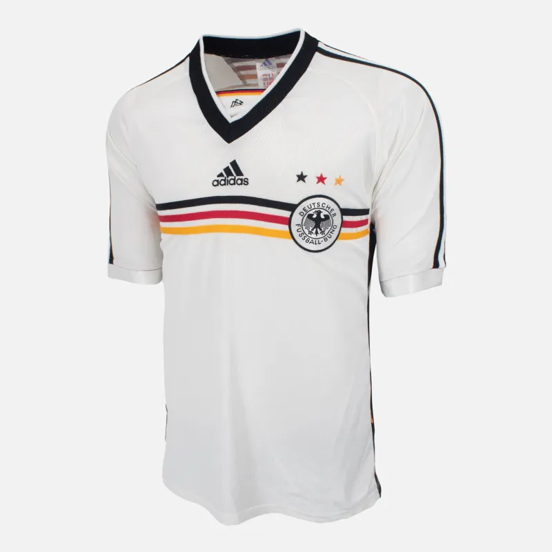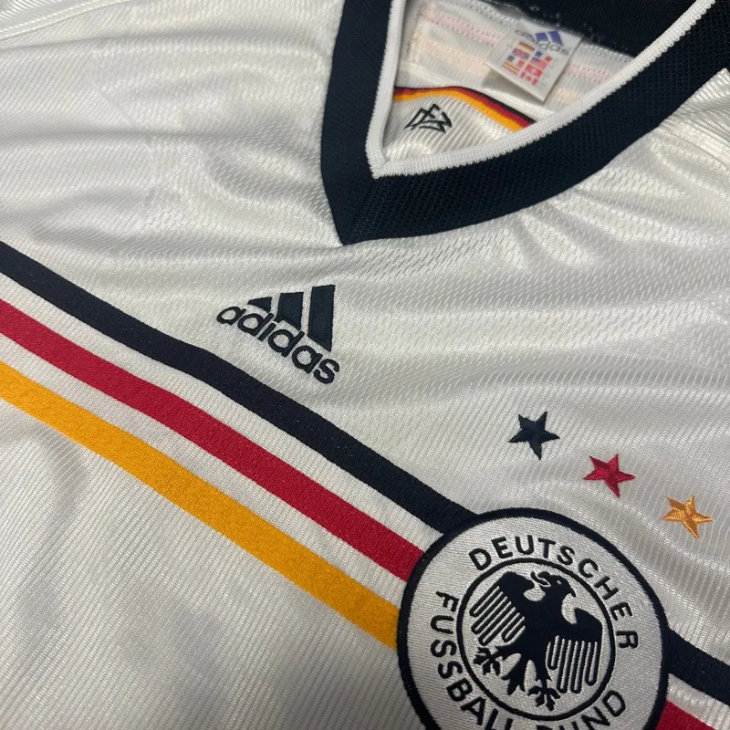 Germany home football shirt from 1998-00 including Euro 2000. Featuring the traditional white base with black, red, and gold trim across the chest, proudly displayed as the adidas three stripes alongside the iconic DFB crest with three stars. Worn by legends like Oliver Bierhoff and Lothar Matthäus.