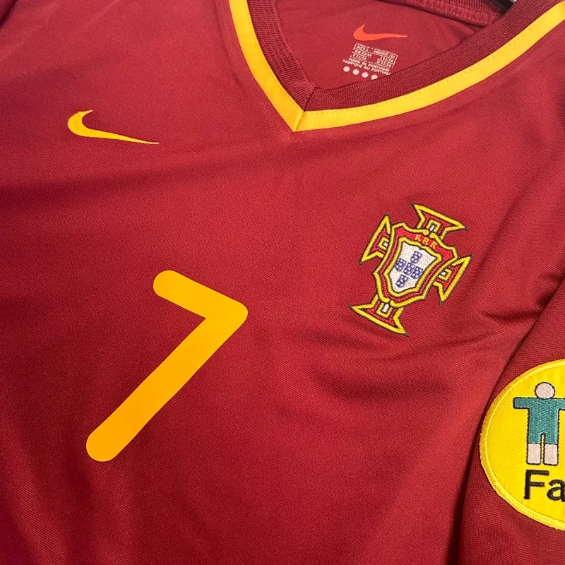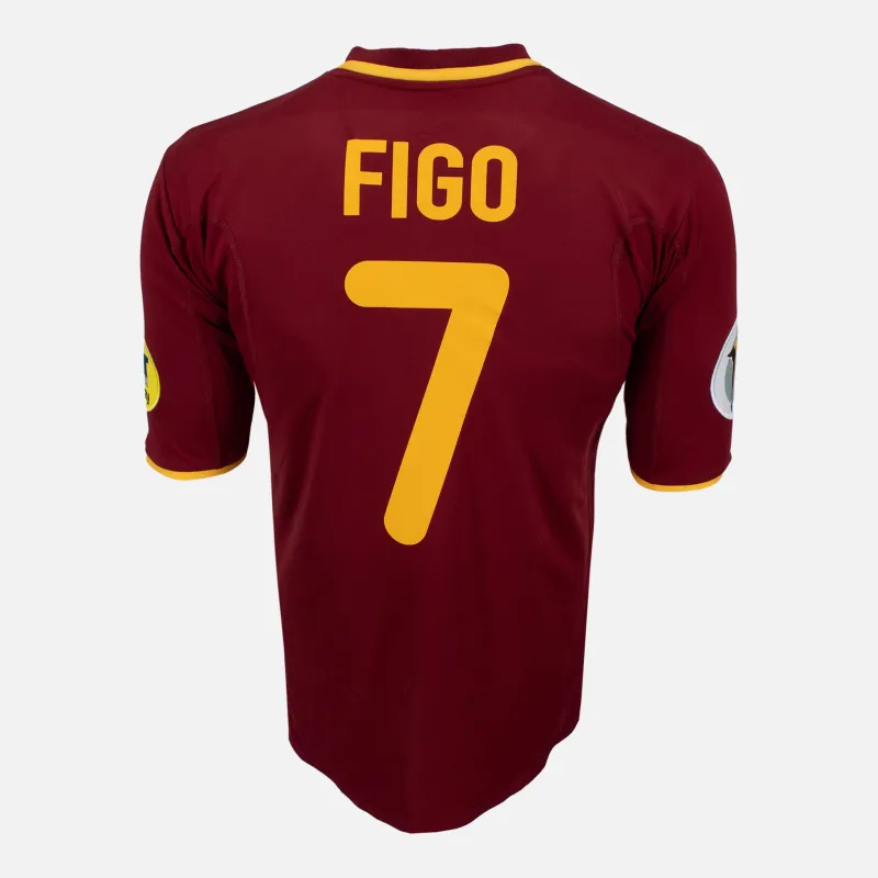 Luís Figo Portugal Home football shirt from 2000-02 including Euro 2000. Portugal reached the semi-final of Euro 2000 including memroabilia wins over England and Germany in the group stages. Maroon/Red Nike design with yellow detail. Includes Euro 2000 patches and Figo 7 name and number print.