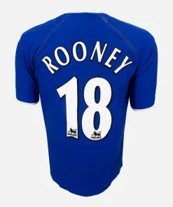 Wayne Rooney, Everton Home shirt from the 2003-04 Premier League season. This kit features a classic blue design with white crew neck collar, mesh style panneling, Kejian sponsor across the front. Rooney 18 felt Premier League name and number.