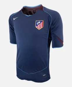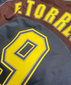 Fernando Torres, Atletico Madrid Away football shirt, from the 2004-05 season. Rare Total 90 navy and maroon design, complete with vibrant yellow Torres nameset. Sponsor-less version with LFP stitches patch on right sleeve.