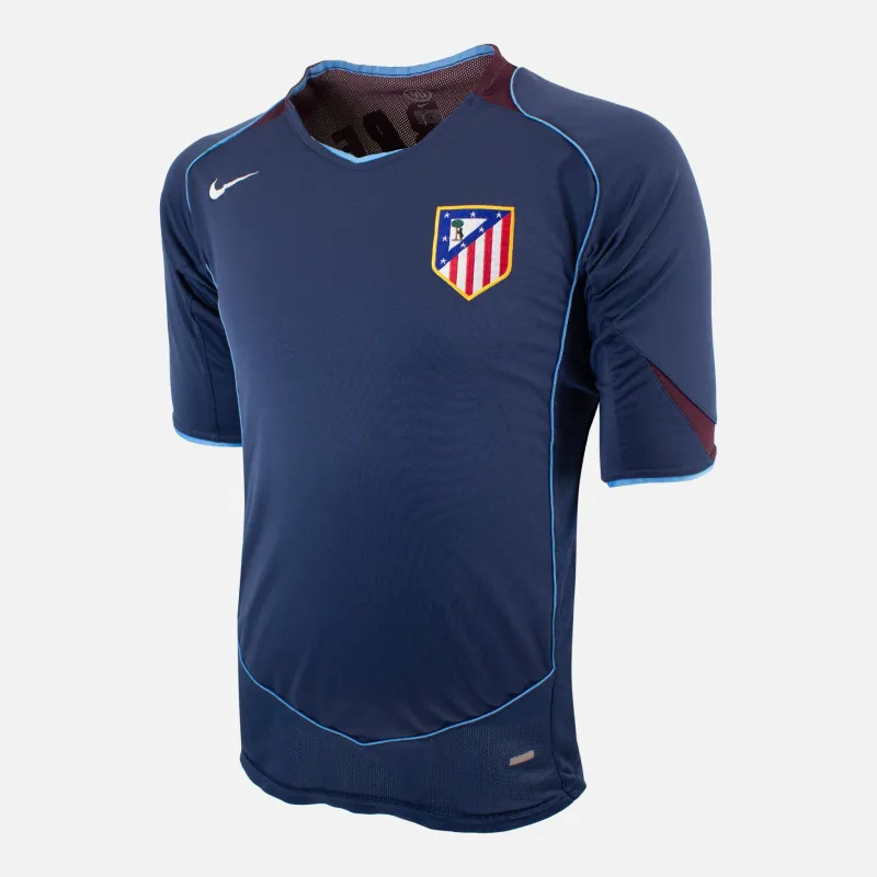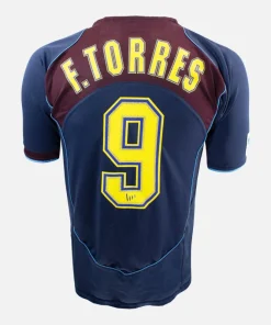 Fernando Torres, Atletico Madrid Away football shirt, from the 2004-05 season. Rare Total 90 navy and maroon design, complete with vibrant yellow Torres nameset. Sponsor-less version with LFP stitches patch on right sleeve.
