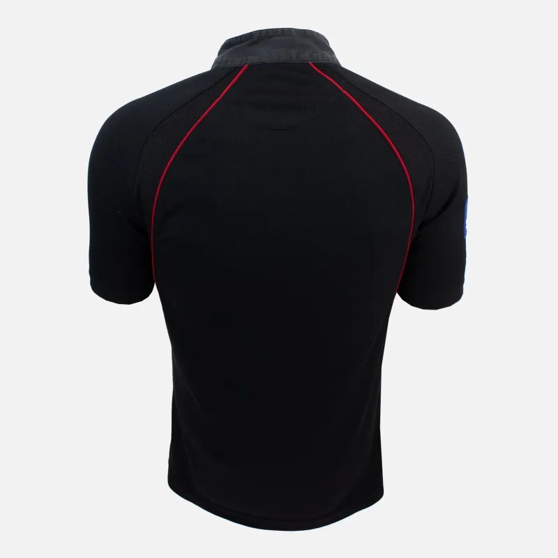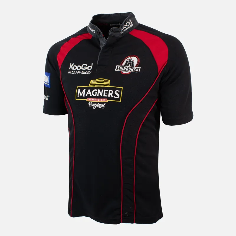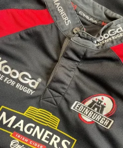 Edinburgh Rugby union home shirt from 2007-08. Black design with red detail throughout, Magners sponsor across the front, denim button collar