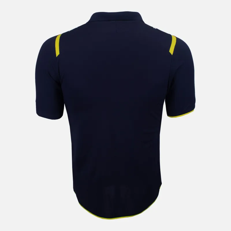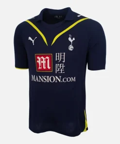 Tottenham Hotspur Away football shirt from the 2009-10 season. Striking navy and neon yellow design from an iconic era in which Bale, Modric and Defoe secured a 4th place finish and the clubs first qualification to the UEFA Champions League This kit features a thick navy cotton with the felt Mansion sponsor across the front.