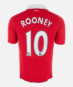 Wayne Rooney, Manchester United Home football shirt from the 2010-11 season. As worn in the Premier League title winning season notable for Berbatov’s hat-trick vs Liverpool and that Rooney’s overhead kick vs Man City. This kit features a red design with white detail and AON sponsor across the front.