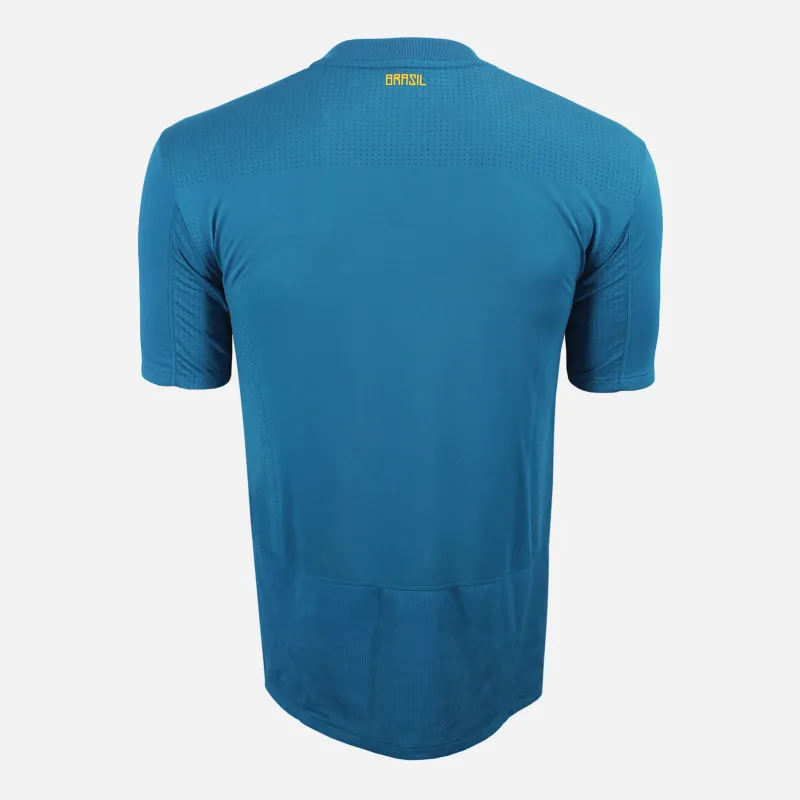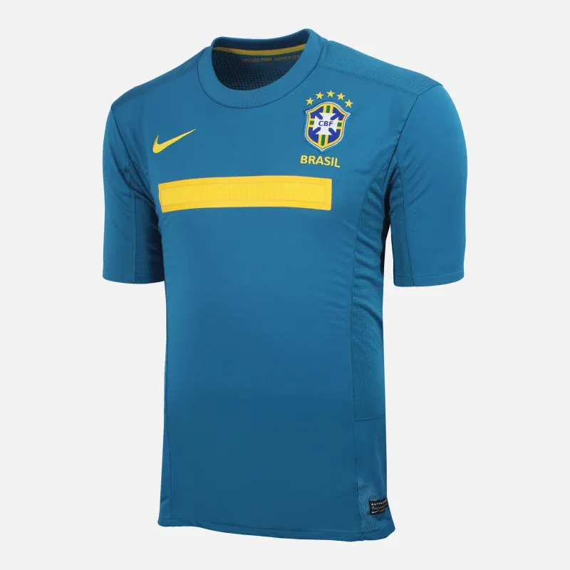 2011-12 Brazil Away football shirt in the standout teal colourway, one of Nike’s boldest Brazil kits. Clean minimalist front with the bright yellow chest bar and matching yellow Swoosh, finished with the CBF crest and five stars above the badge. Lightweight Nike performance fabric with breathable mesh side panels for a cooler feel and a sharp athletic fit. Official Nike Brazil merchandise.
