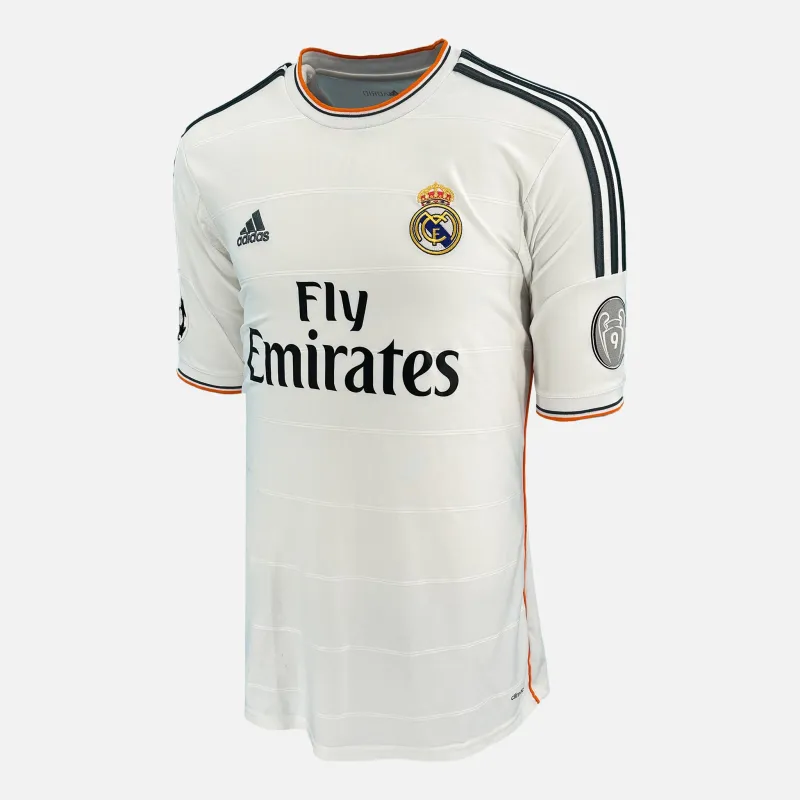 Cristiano Ronaldo Real Madrid Home football shirt from the 2013-14 La Décima season. Vintage Madrid year in which they won a record 10th European Cup. Kit comes complete with Ronaldo nameset and Champions League/ 9 times winner bagdes, as worn in the final. Authentic kit in all white made by Adidas with Fly Emirates sponsor across the front. Champions League right, 9 time winners on left sleeve.
