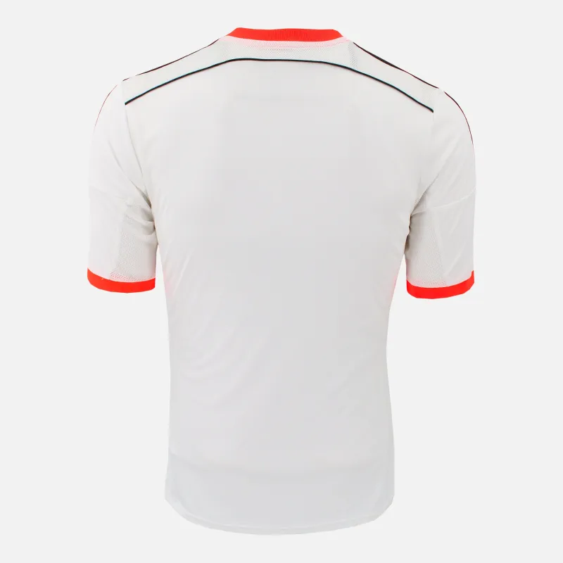 Fulham home football shirt from the 2014-15 Championship season. White and grey striped design with black and orange detail, Marathon Bet sponsor cross the front.