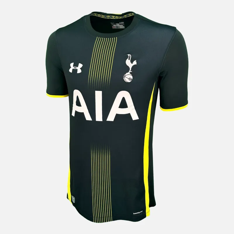 Tottenham Hotspur away football shirt from the 2014-15 season. This kit features an all black design with yellow vertical stripes, AIA sponsor across the front.