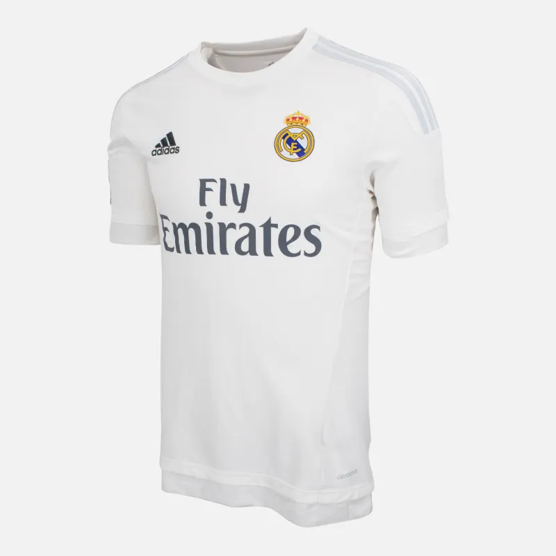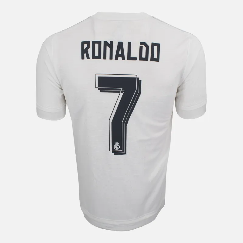 Cristiano Ronaldo Real Madrid Home football shirt from the 2015-16 Season. Madrid won a record 11th European Cup, as Ronaldo scored the winning penalty vs Atletico Madrid. Classic white kit with silver detail, La Liga patch on sleeve, Fly Emirates sponsor across the front. Ronaldo 7 print on reverse.