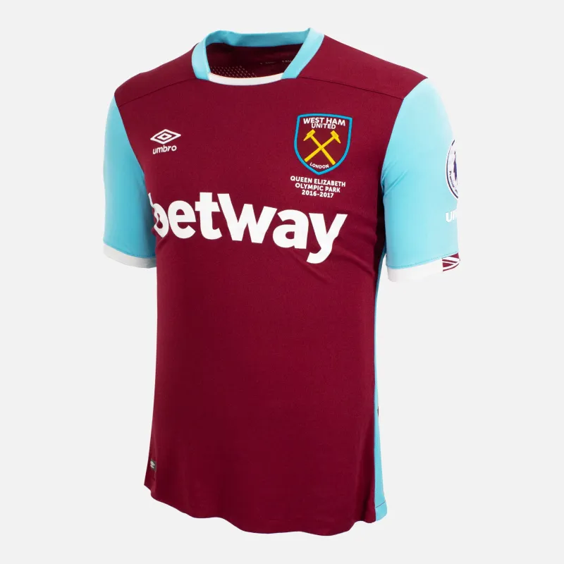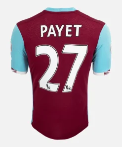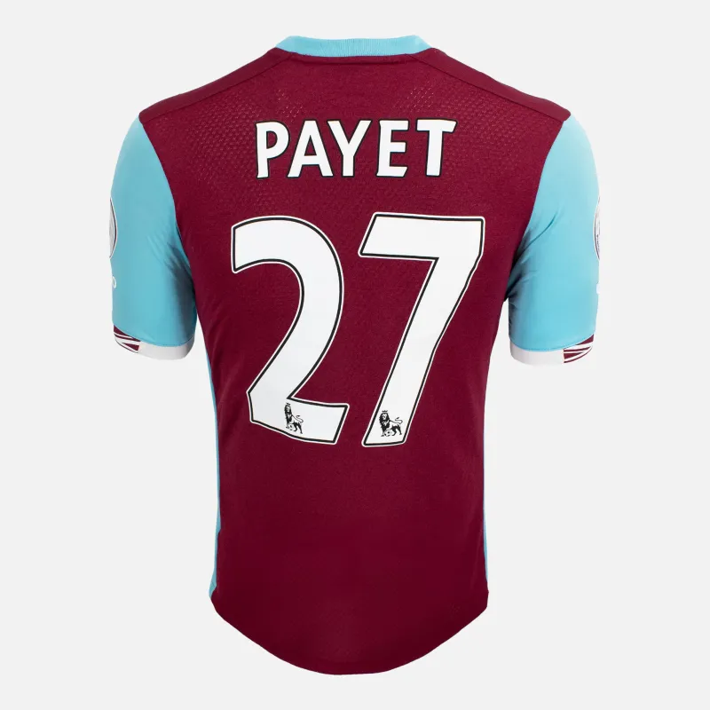 Dimitri Payet, West Ham United Home football shirt from the 2016-17 season. Including Queen Elizabeth Olympic Park detail under crest, celebrating the hammers first season in the new stadium. Payet 27 printing on the reverse, a hammers cult hero and winner 2016 Player of the season. Classic home shirt in Claret and Blue features the betway sponsor across the front, Premier League badges on both sleeves.