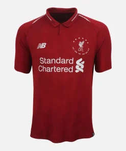 Liverpool Home football shirt from the 2018-19 season, Champions League 6 times winners special edition. Includes 6 star and year embroidery around the badge. This kit features a dark red design with white detail, button collar and Standard Chartered sponsor.