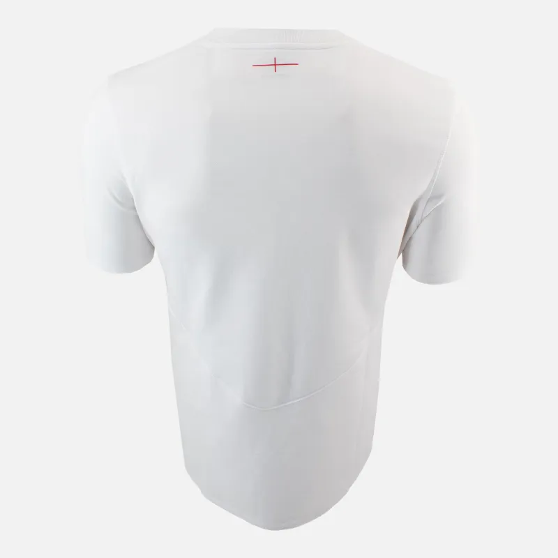 England Rugby home shirt from 2020-21, slim fitting version with rubber roses crest and O2 sponsor. All white design with red detail and grey dotted pattern.