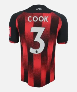 AFC Bournemouth Home football shirt, post covid-break 2020 Premier League edition kit. Rare version of the 2020-21 style home shirt, this kit was used in limited number of games after the Covid pandemic break in 2020. Featuring the Vitality sponsor across the front, NHS Badge, Premier League badge and Mansion sponsor on the sleeve this version wasn’t available to the general public. This kit would later be released with the MSP Capital sponsor for the 2020-21 season. Player spec with Cook 3 name and number on the reverse.