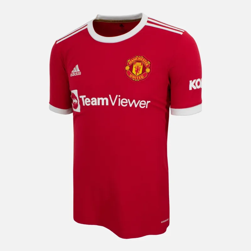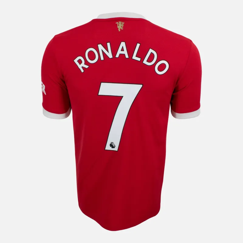 Cristiano Ronaldo Manchester United home shirt from the 2021-22 season. The iconic season in which Ronaldo returned to Old Trafford, scoring 24 goals across all competitions. This kit features a classic red design with white crew neck collar, Team Viewer sponsor across the front and Ronaldo 7 name and number on the reverse.