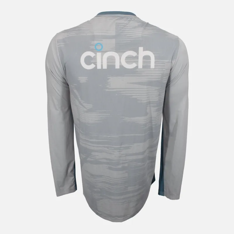 England Cricket long-sleeve training shirt from 2022-23, Castore all grey kit with Cinch sponsor. Official ECB training tee, light-weight material and stretch fit material for high performance atheletes.