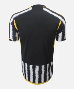 Juventus home football shirt from the 2023-24 season. Official Adidas kit featuring the classic black and white stripes with a modern twist, finished with the Juventus crest and Adidas branding to the chest and electric style Jeep sponsor across the front. Yellow trim throughout, lightweight AEROREADY performance fabric for breathable comfort, making it ideal for matchdays, training or everyday wear.