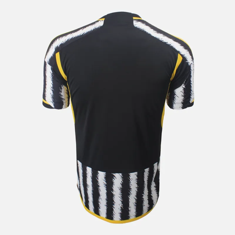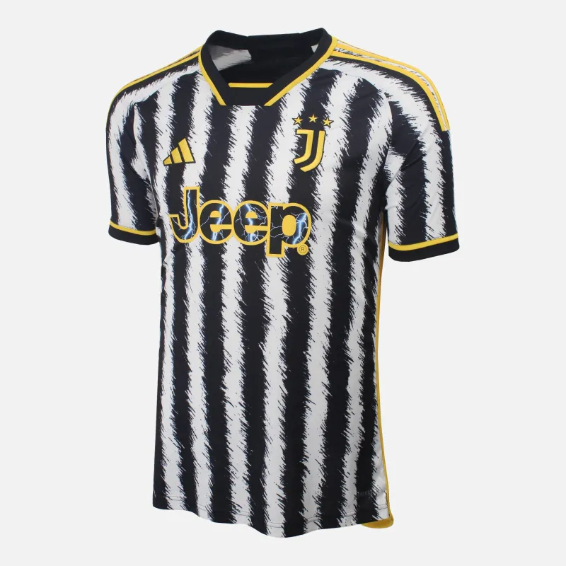 Juventus home football shirt from the 2023-24 season. Official Adidas kit featuring the classic black and white stripes with a modern twist, finished with the Juventus crest and Adidas branding to the chest and electric style Jeep sponsor across the front. Yellow trim throughout, lightweight AEROREADY performance fabric for breathable comfort, making it ideal for matchdays, training or everyday wear.