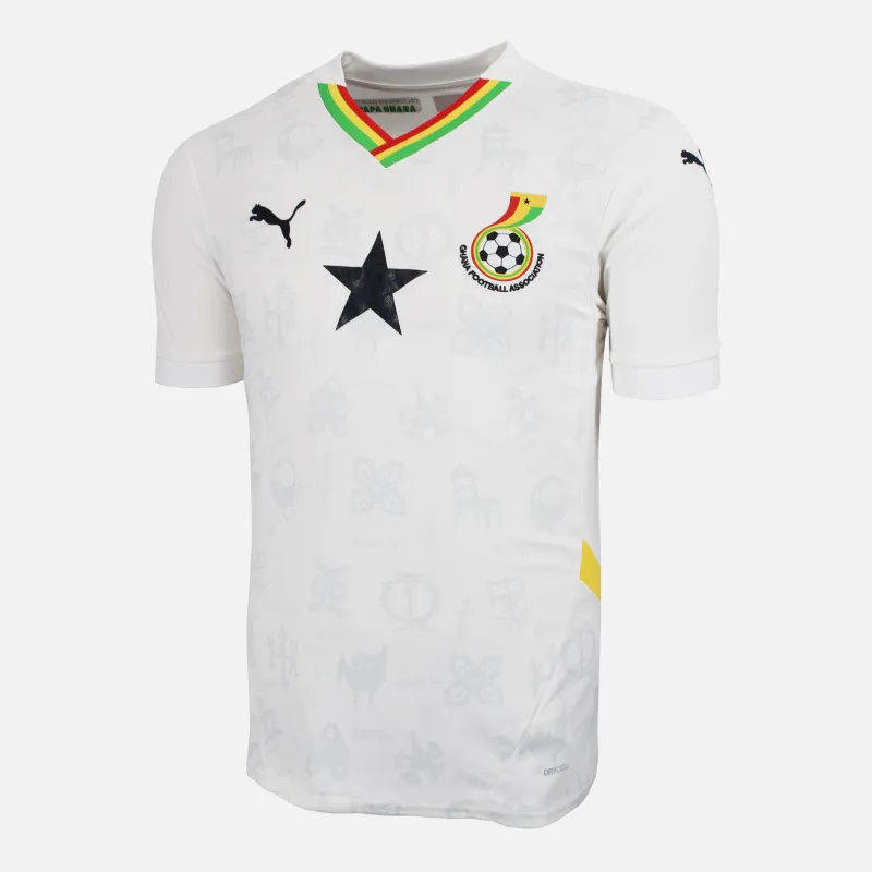 Ghana home football shirt from the 2024-25 season. Official Puma national team kit in classic white, featuring the iconic black star to the centre and Puma branding on the chest and sleeves. Finished with a red, yellow and green V-neck collar and subtle tonal graphics across the fabric inspired by Ghanaian culture, with DryCell performance material for lightweight, breathable comfort.
