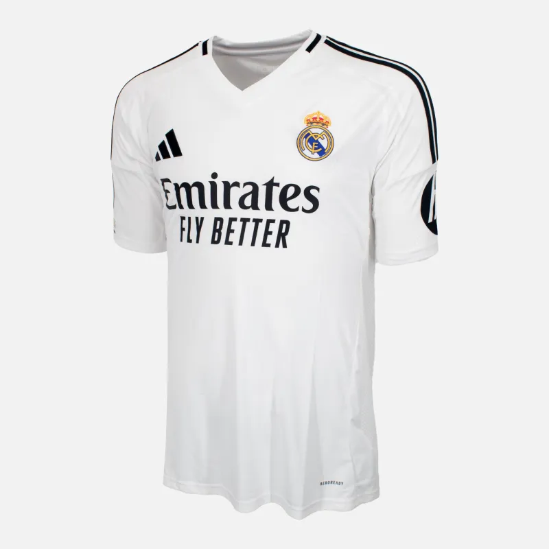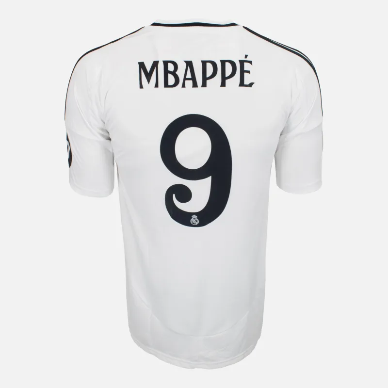 Kylian Mbappé Real Madrid Home football shirt from the 2024-25 Season, complete with Champiosn League 15 winners sleeve and foundation patch. Mbappe’s debut season at The Galacticos, scoring over 40 goals in all competitions. Original Adidas white kit with HP sleeve sponsor and Emirates sponsor across the front. Mbappe 9 on the reverse and full sleeve badges.