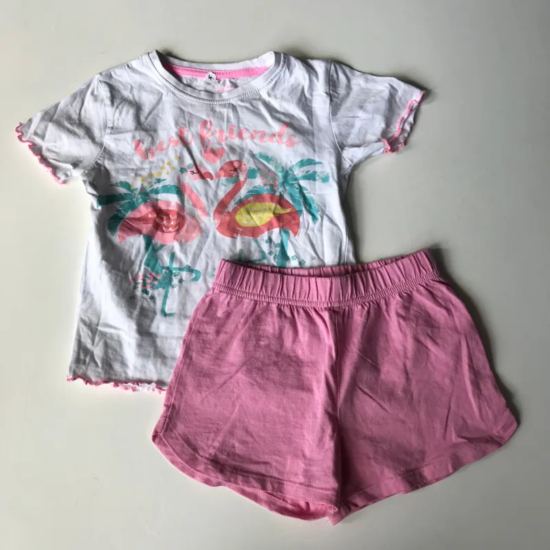 Preloved bundle of a tee and shorts. Flamingo print. Brands may vary.