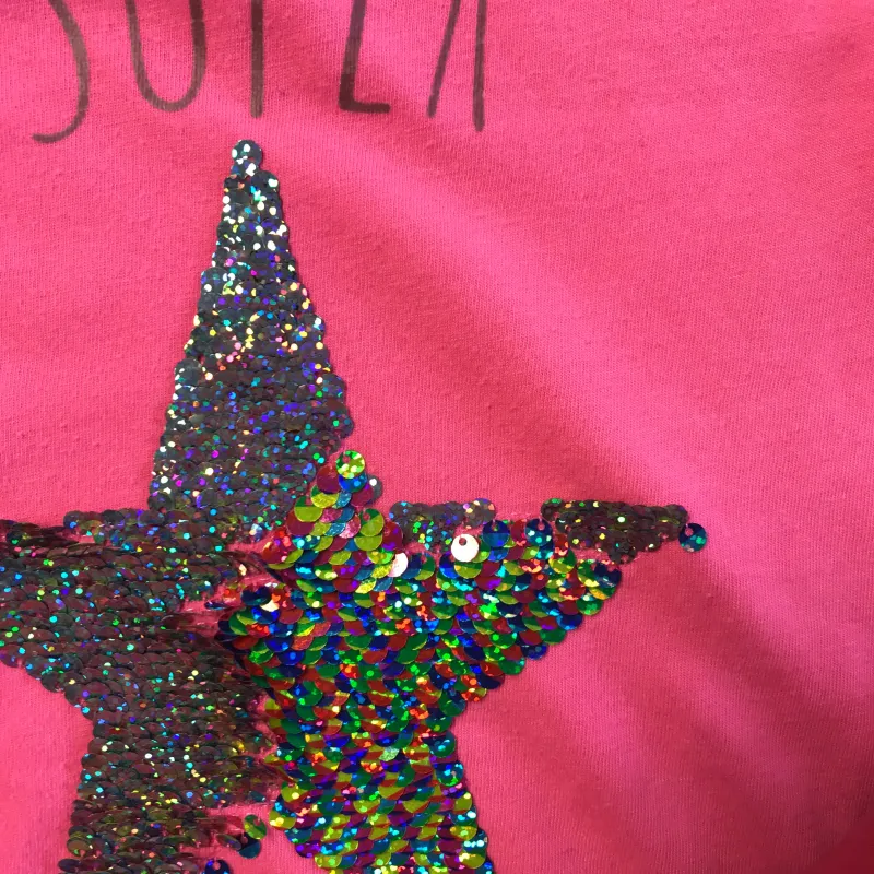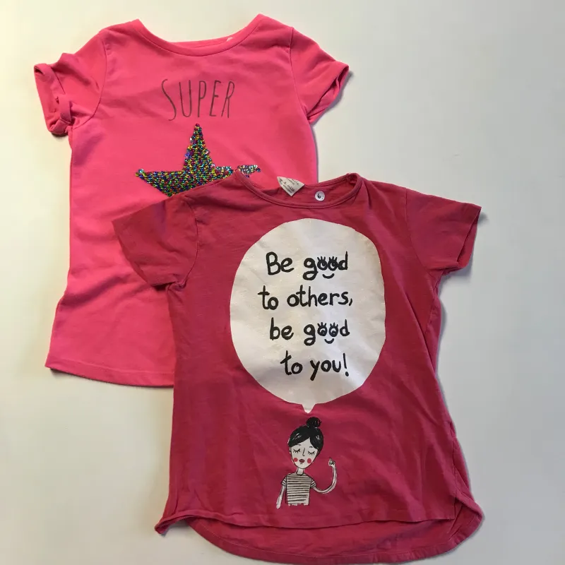 Preloved bundle of tees, bright pink with sparkly star and red with text ‘Be Good to Others Be Good to You’