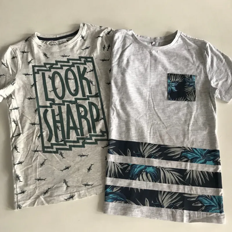 Preloved bundle of 2 tops. Palm tree pattern t-shirt and ‘Look Sharp’ shark pattern t-shirt.