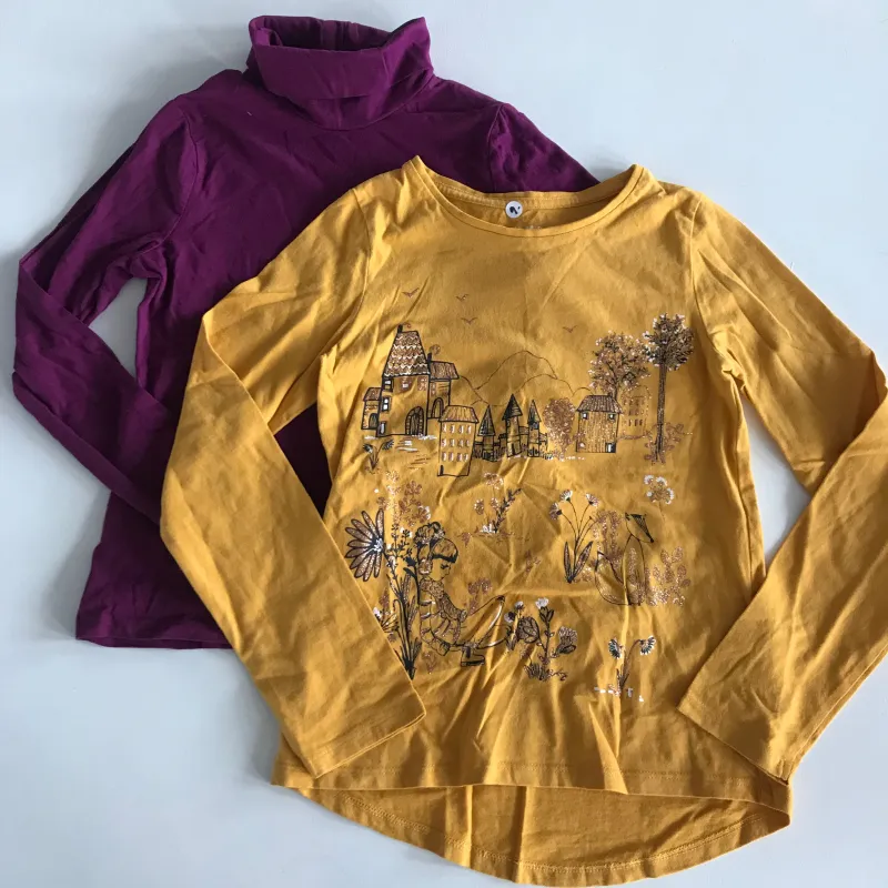 Preloved bundle of 2 tops. Purple long sleeve turtleneck top and orange glittery landscape long sleeve top.