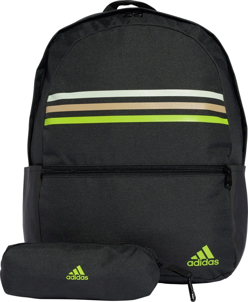 Classic 3-Stripes in gradient colours give this adidas backpack standout style. Stay organised with all the pockets you need, including one on the front and one on each side. The coated bottom ensures it stands up to daily use, and adjustable shoulder straps make comfort a priority. The coordinating pencil case zips for easy access to writing utensils or other small essentials.