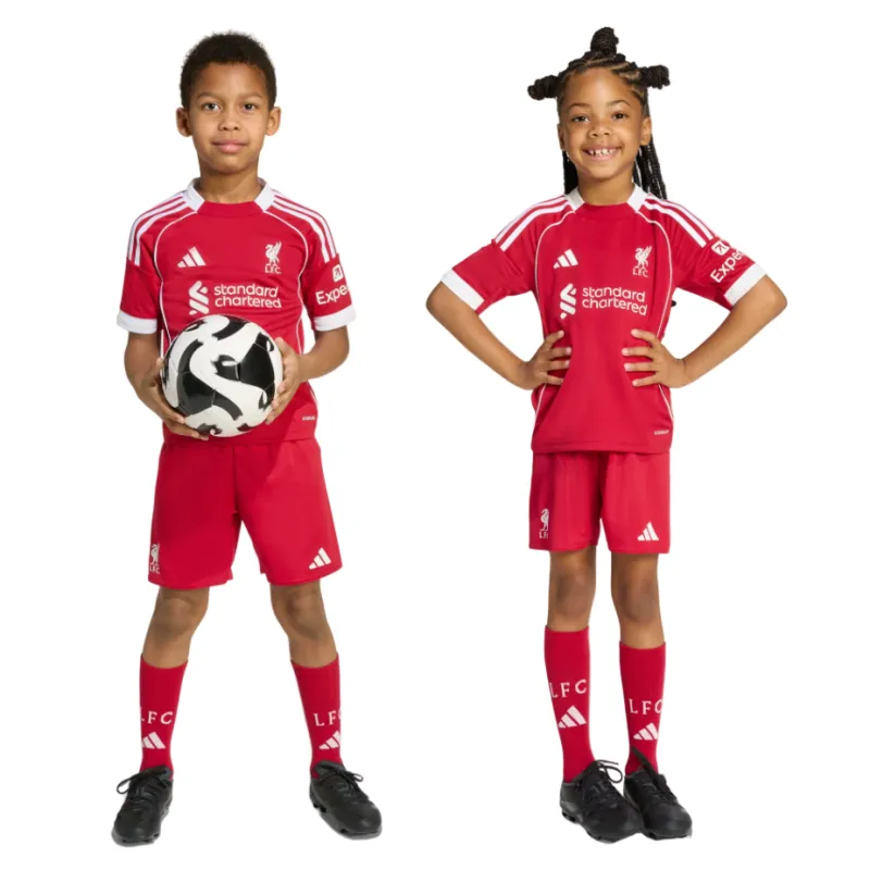 The Liverpool FC Kids Home Mini Kit for 25/26 is perfect for the club’s youngest fans. Designed in the iconic red with crisp white details, it mirrors the look worn by the pros on matchday. Made with lightweight AEROREADY fabric, it keeps kids cool, dry and comfortable from kick-off to final whistle. Complete with both the jersey and shorts, it’s a winning set for every little Red.