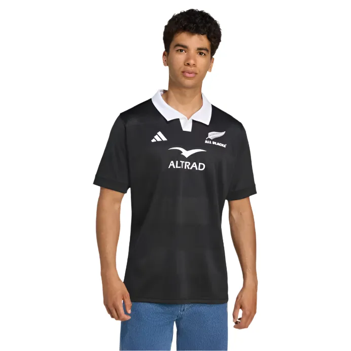 The All Blacks 25/26 Home Jersey from Adidas is a powerful tribute to the most legendary team in world rugby, combining heritage, pride, and cutting-edge performance. Engineered in lightweight, breathable fabric, it keeps you cool and comfortable whether you’re pushing your limits on the pitch or roaring from the stands. The iconic black base is brought to life with subtle tonal graphics, while the crisp white collar delivers a bold nod to classic rugby style. Finished with the instantly recognisable All Blacks silver fern, Adidas logo, and sponsor branding, this jersey is more than just kit – it’s a statement of loyalty.