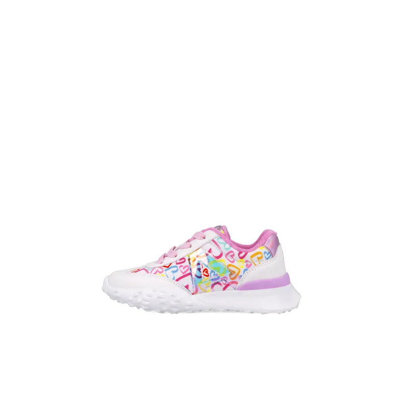 A sweet girls trainer from Agatha Ruiz for her this season. Crafted in a shimmering white with colourful heart detailing to the sides. Fastened with pink laces and lined with a soft pink textile. They are sure to be a favourite this season.