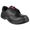 A practical safety shoe with water resistant leather upper, steel toe, Steel midsole, injected PU scuff cap for extra durability and dual density PU outsole.