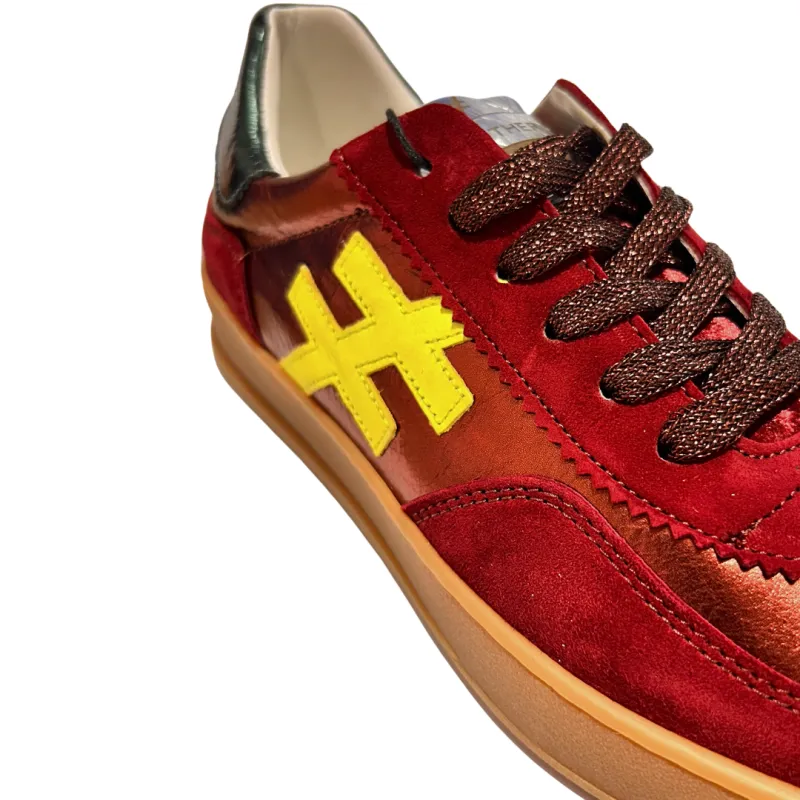 A gorgeous pair of platform trainers for her from Another Trend. These super stylish platform trainers feature a soft burgundy suede and leather upper with a deep green leather to the collar, with Another Trend branding to the side in yellow. Lace fastening. A colourful trainer that will complete any outfit this Summer.