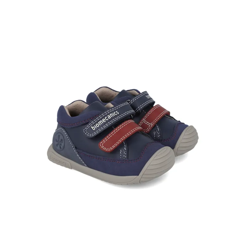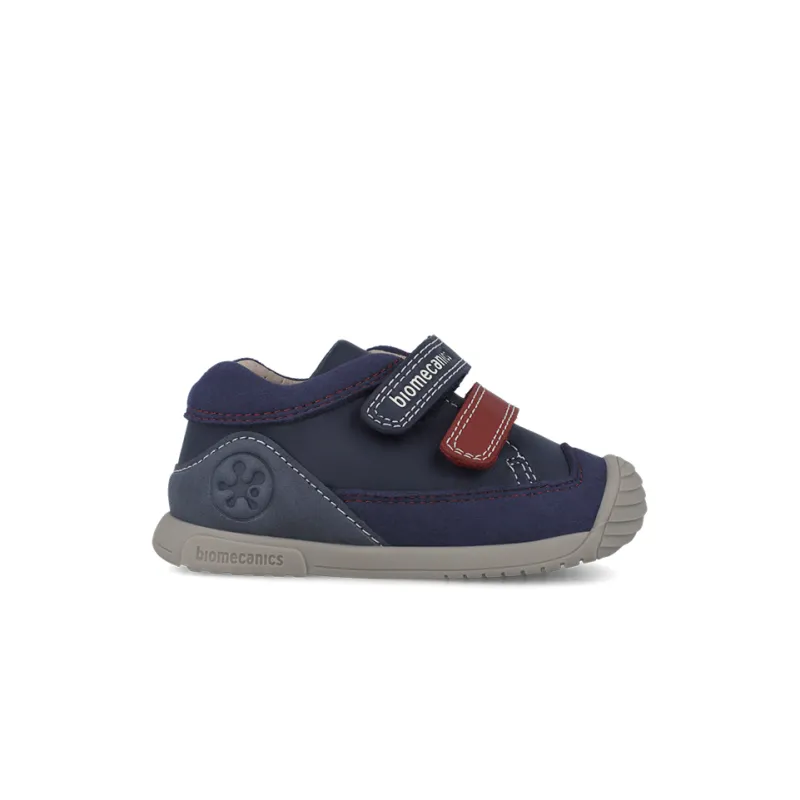 A lovely pair of navy shoes for your little boy from Biomecanics. The 251124-A shoe sports a leather and synthetic upper in navy with white and red detailing. This adorable shoe is perfect for little feet exploring the world around them. The grey outsole wraps up over the toe offering protection while the light blue panel at the heel helps to keep the foot stable. The trainer fastens with two velcro straps for a secure fit while also being easy to put on and take off.