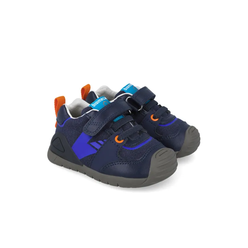 A modern navy trainer for your little boy from Biomecanics. The 251131-B trainer is crafted from a navy leather and textile upper with blue and orange detailing. The trainer sits on a grey outsole that offers adequate flexibility for the adventures of little feet. The outsole wraps up over the toe for extra protection. Complete with the Biomecanics removable moisture control insole that keeps feet dry. The trainers fasten with bungee laces and a single velcro strap for a secure fit while also being easy to put on and take off.