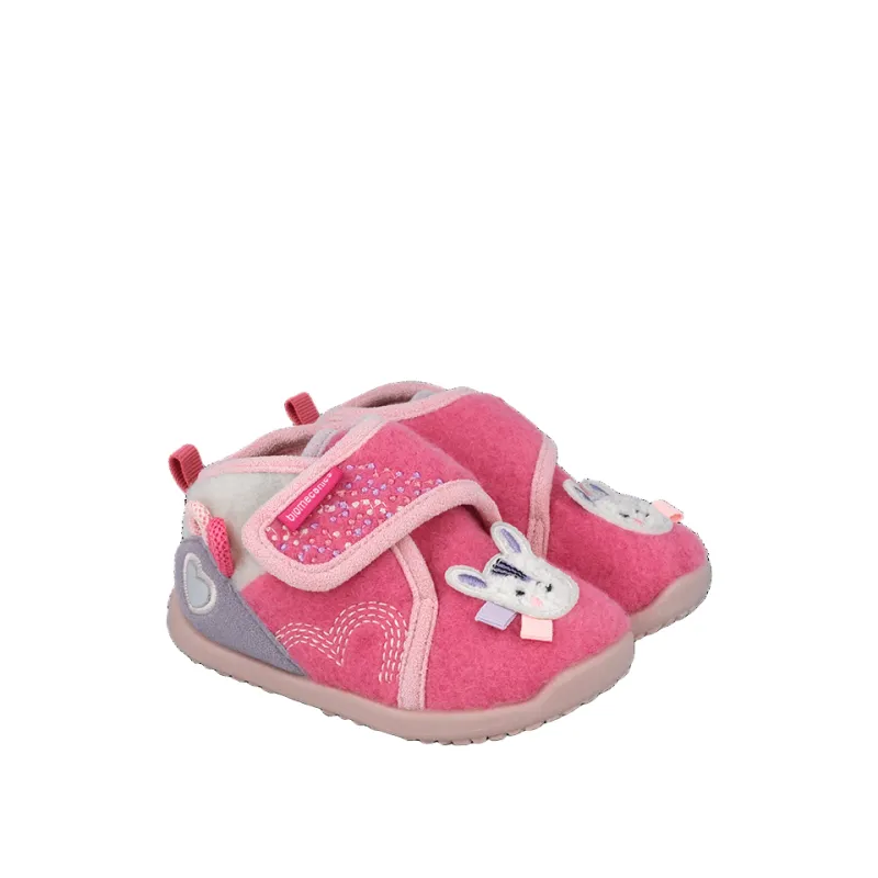 The Biomecanics 251172-A329 girls’ slipper in chicle is a fun and cosy choice for home comfort. With its soft pink felt upper, embroidered details, and adorable bunny motif, it’s perfect for little ones who love playful style. Designed with Biomecanics’ ergonomic support and a flexible sole, these slippers are ideal for safe, comfy wear around the house.