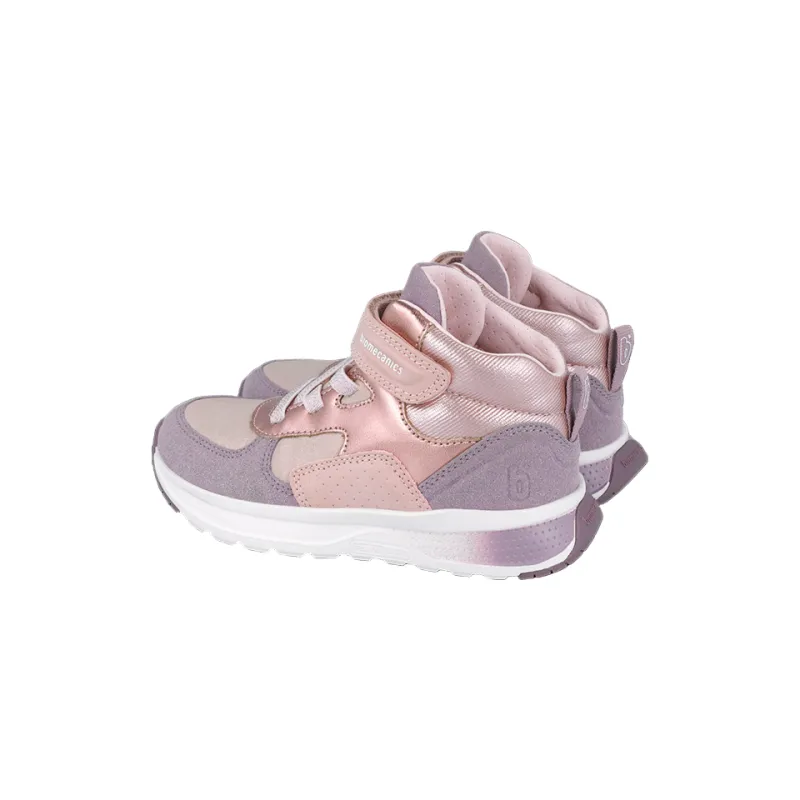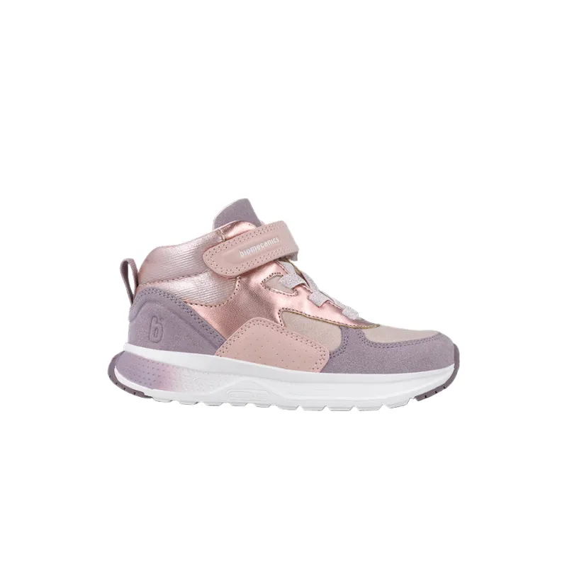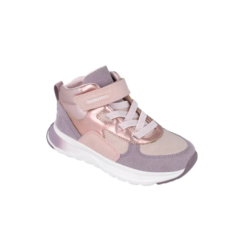 The Biomecanics 251251 is a lightweight high-top trainer designed for active kids. Its soft pink and lilac tones give a fun, sporty look while the breathable materials keep feet fresh all day. With a reinforced heel, flexible sole and high-top support, it encourages natural movement and stability. The easy Velcro strap and elastic laces make them simple for kids to slip on and off.