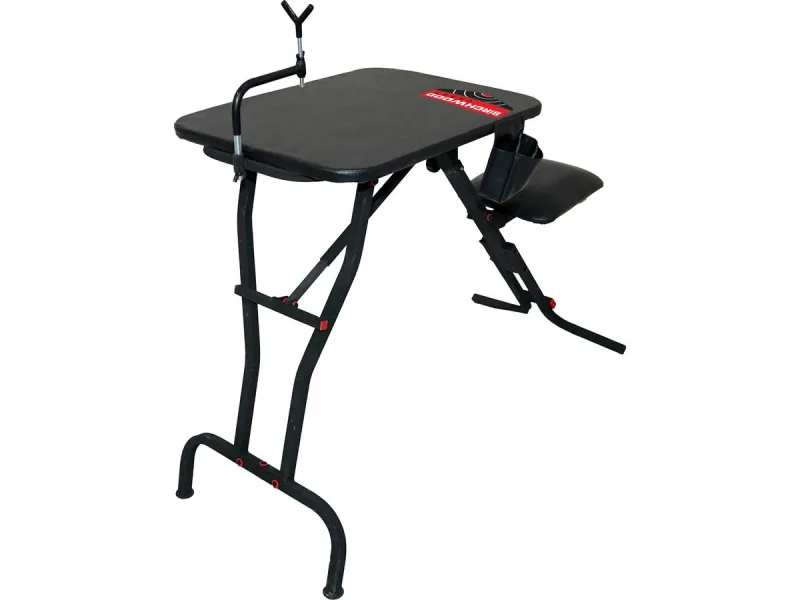 The Birchwood Casey Ultra Steady Portable Shooting Bench offers a stable, comfortable, and spacious shooting surface for target practice or field hunting. The 21” wide x 28” long padded bench top provides comfort and a non-scratch surface protecting your gun, while also providing two additional gear pouches for ammunition or accessories. The gun rest is versatile to accommodate ambidextrous shooters and is adjustable to any position desired; also coated in durable non-scratch rubber. 12” wide x 14” deep x 1” thick seat folds up. Folds flat for space saving storage and easy transport. The bench as a whole weighs a mere 32lbs.with a weight limit of 300 lbs.