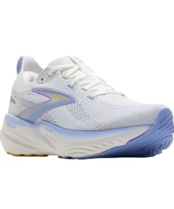 Brooks offers an excellent women’s running Trainer, equipped with their distinctive GuideRails support system, designed to keep you comfortable during your runs. The midsole is infused with tuned nitrogen, providing soft landings and a responsive push-off. The Glycerin GTS 22 Trainer is ideal for road running, delivering a smooth and stable experience. It features a white design with blue and lilac accents, laces for a secure fit, and a padded collar for added support, all adorned with the Brooks logo.