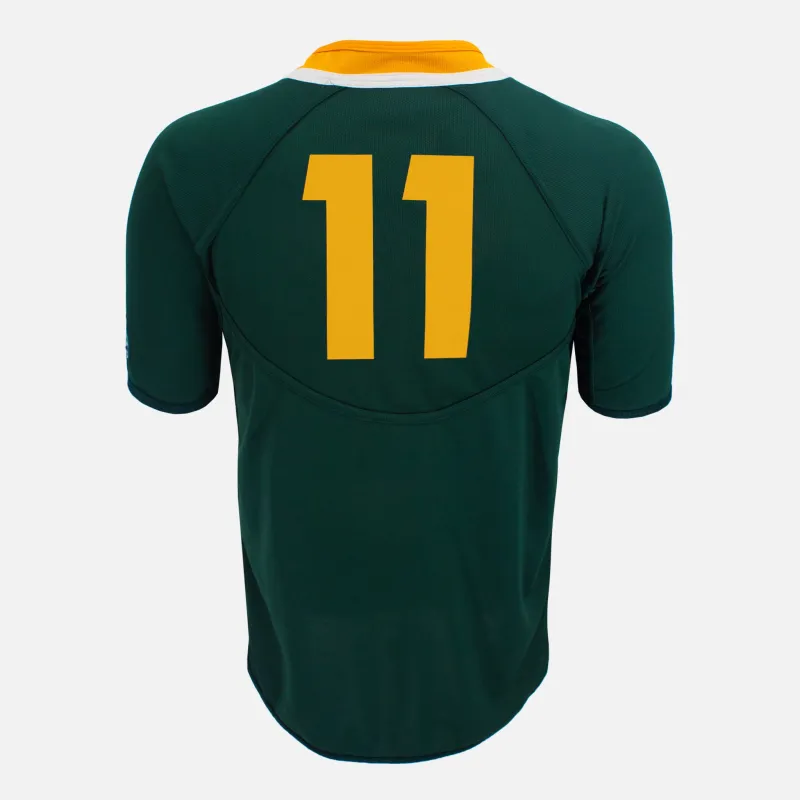Bryan Habana personally signed South Africa 2011–13 pro version rugby shirt, front autograph. A Rugby World Cup winner and the IRB Player of the Year in 2007, Habana finished his career with 67 Test tries, the most in South African history. He remains joint-top try scorer in Rugby World Cup history and one of the quickest wingers to play the game.