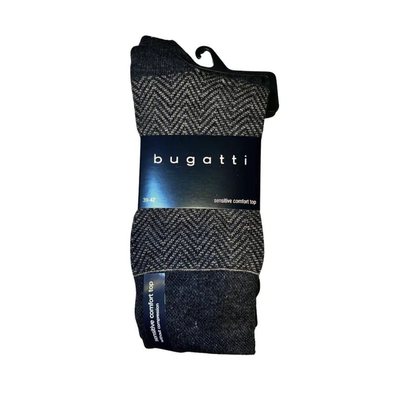 A classic pack of 2 socks from Bugatti for him. One pair is grey with a light brown zig zag pattern, and the other pair is grey with the Bugatti branding. Featuring a sensitive comfort top for the perfect fit, without compression.