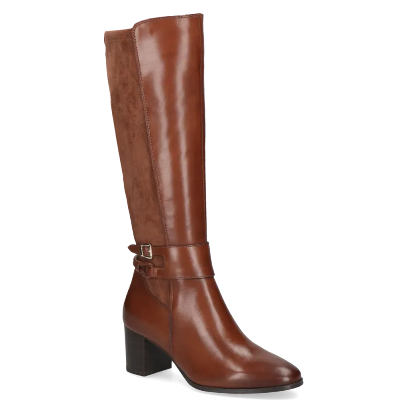 The Caprice Women’s Boot 9-25501-45 in Cognac Comb is a timeless knee-high boot that blends elegance with everyday wearability. Crafted from a mix of smooth leather and soft suede panels, it creates a rich contrast that’s both stylish and versatile. A subtle side buckle detail adds a refined finish, while the block heel provides height without sacrificing comfort. Perfect for pairing with dresses, skirts, or slim trousers, this boot is a wardrobe staple for the season.