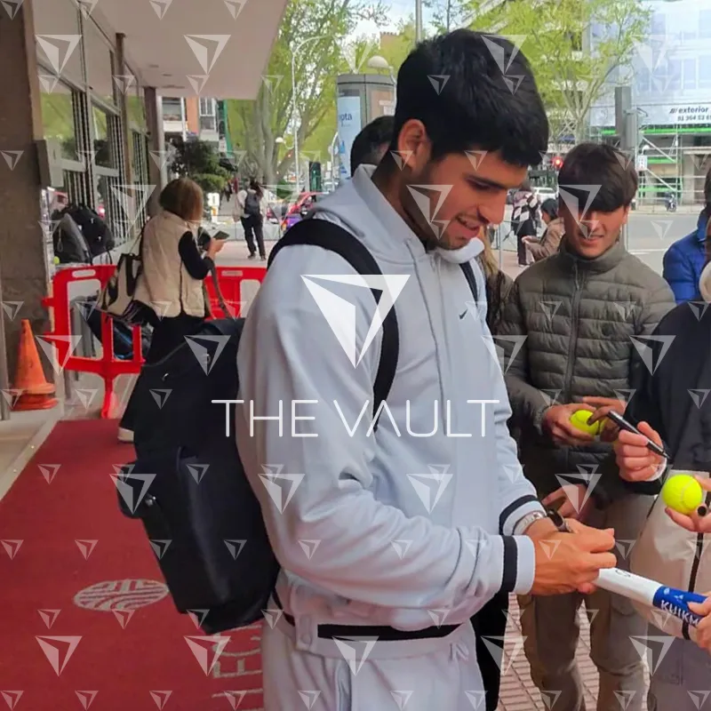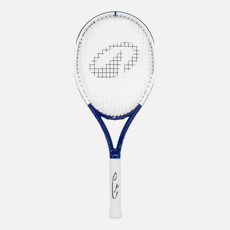 Carlos Alcaraz personally signed tennis racket, Kuikma Hybrid in Blue and White, with white tape grip. A new force in men’s tennis, Alcaraz made history by winning the 2022 US Open and becoming the youngest men’s World No. 1 ever. Renowned for his explosive forehand, lightning footwork, and fearless approach, he’s rapidly shaping a legacy as one of the sport’s brightest stars.