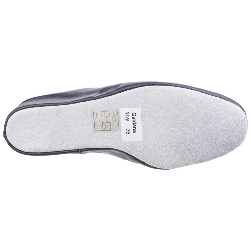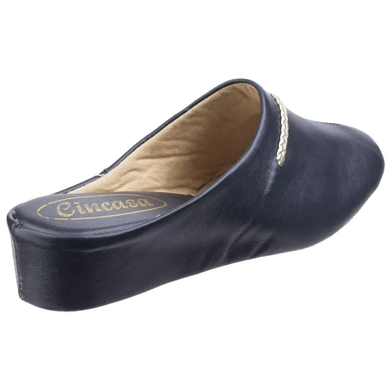 Traditional leather house shoes from Cincasa. This luxury womens mule slipper is crafted with a supple metallic leather upper with vintage designed leather soled base with subtle wedge.